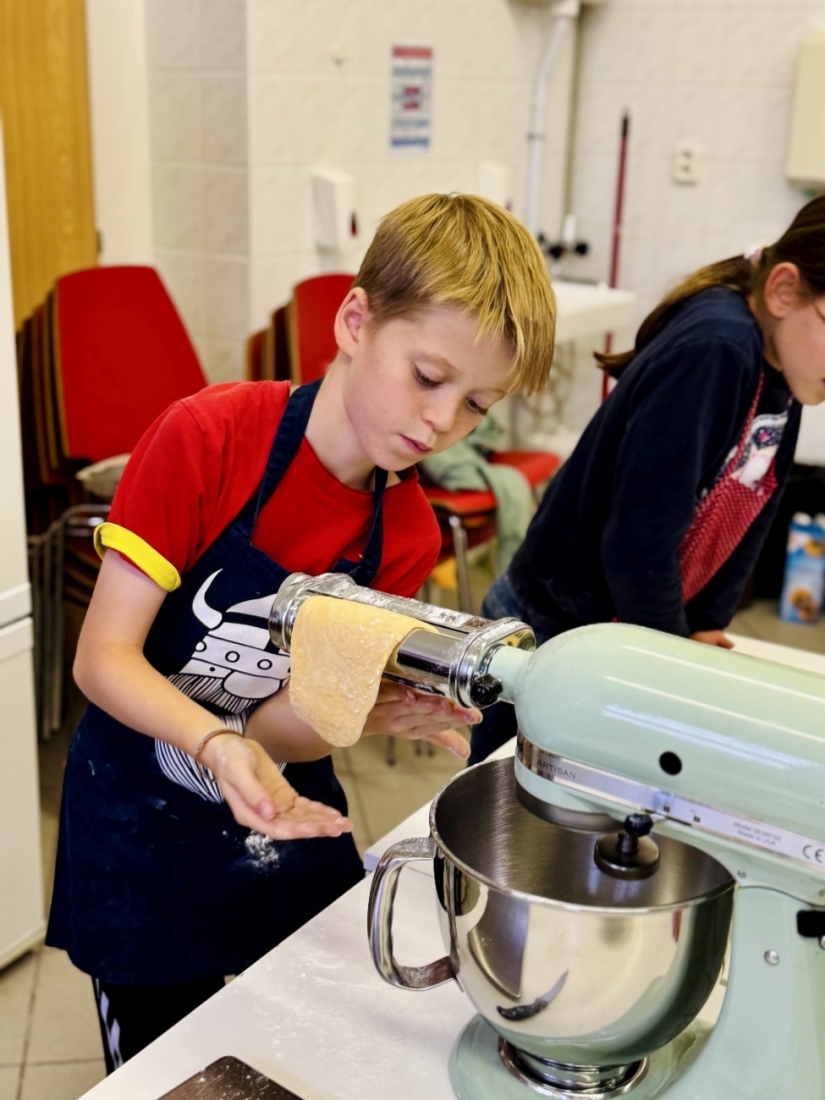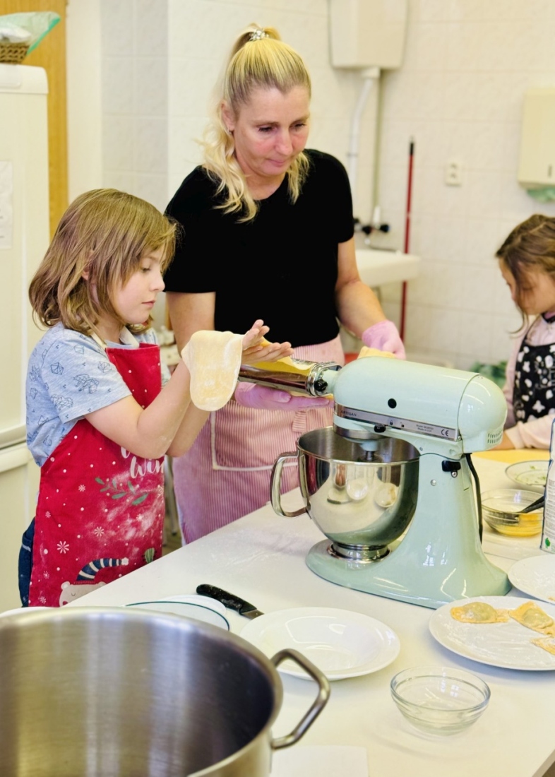 K ruce nám byly strojky na těstoviny, které jsou součástí robotů KitchenAid, takže nám práce šla krásně od ruky. Děti si vyzkoušely válení, plnění i tvarování těstovin – a výsledky stály za to!
