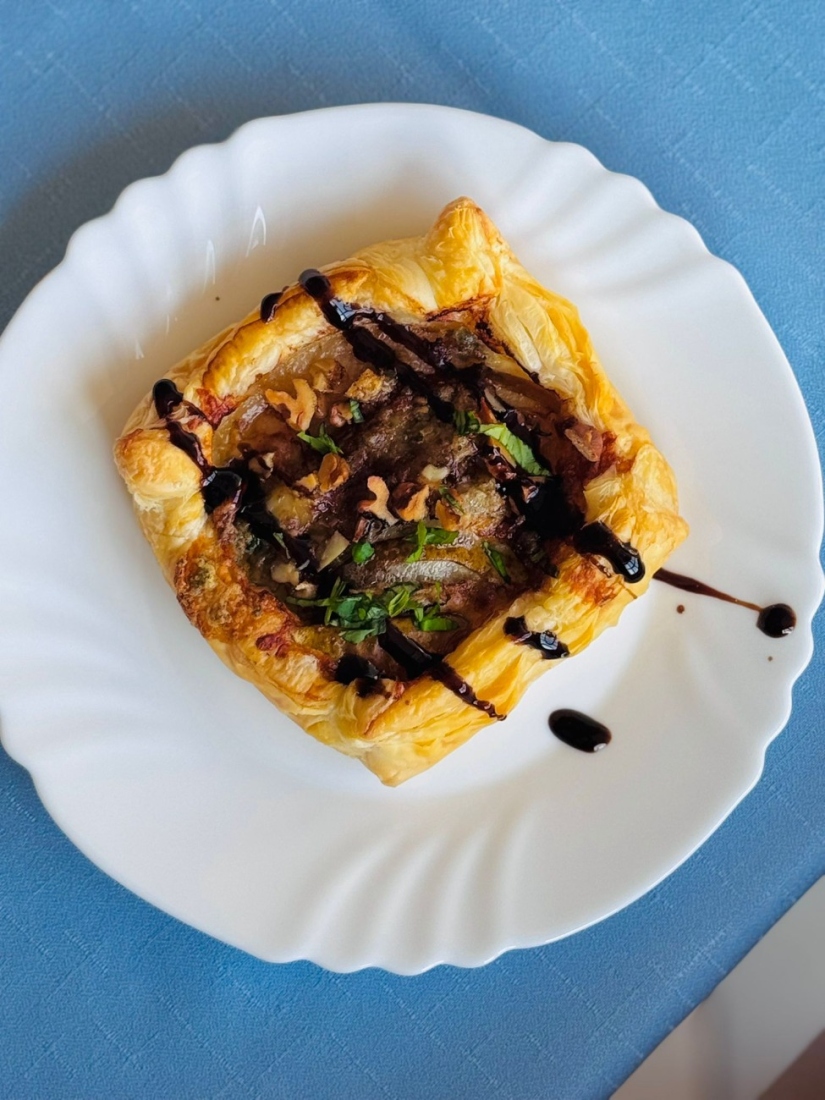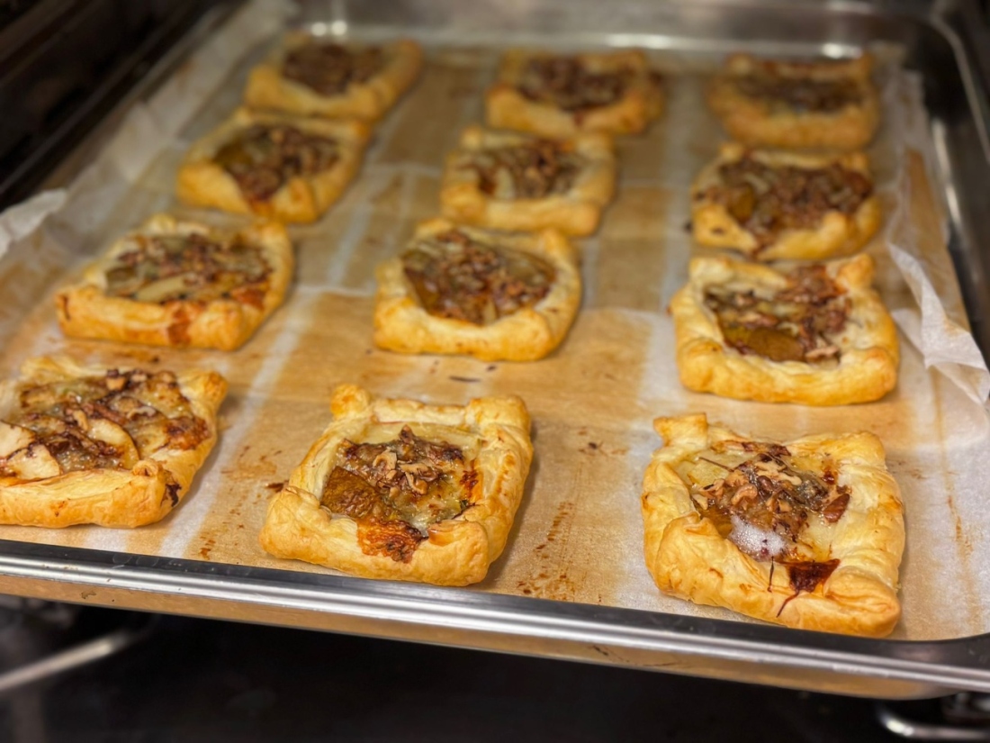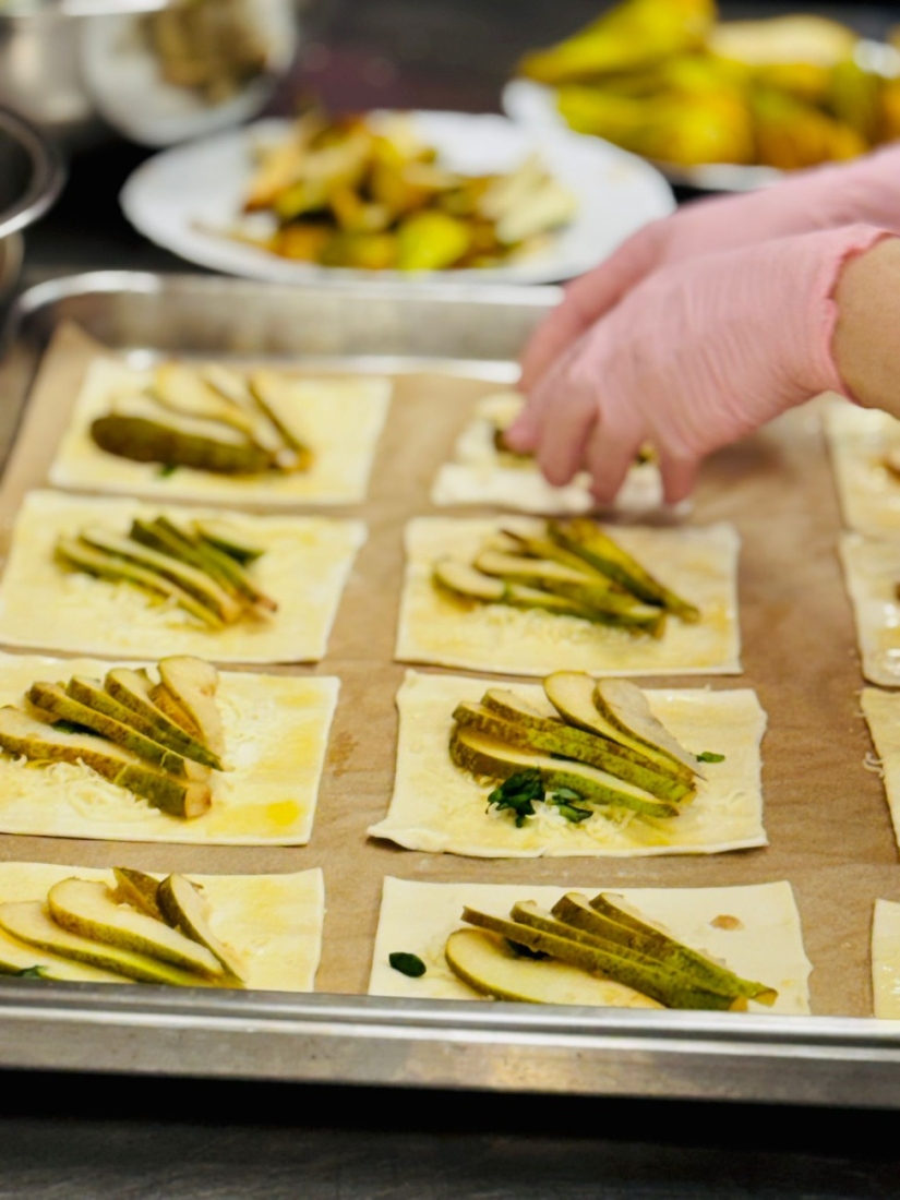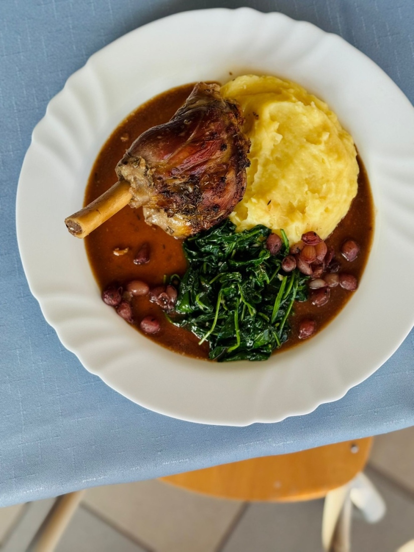 A co se servírovalo? Menu bylo skutečně slavnostní. Hlavní roli si bez debat získalo pomalu tažené jehněčí kolínko z Nového Zélandu – dokonale měkké, šťavnaté a voňavé. Doplnila ho jemná bramborovo-celerová kaše, listový špenát a baby cibulky na červeném víně, které dodaly pokrmu lehkost i eleganci. Úvod večera patřil předkrmu, který potěšil nejen chuťové buňky: tart s hruškami, bazalkou, gorgonzolou a ořechy, dozdobený balsamikovým krémem.