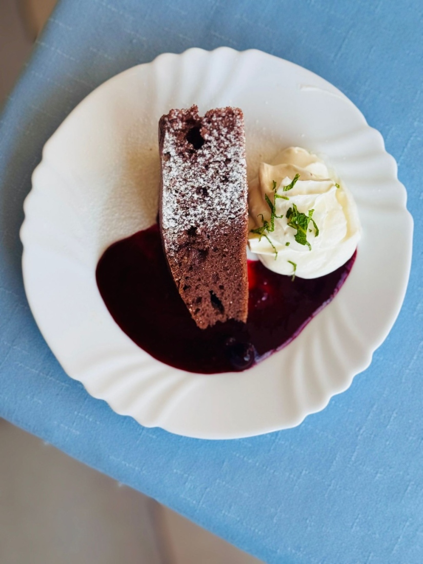 A sladká tečka? Ta byla skutečně nezapomenutelná. Kakaový „Guinness“ dort s limetkovým tvarohem a rybízovou omáčkou nabídl dokonalou rovnováhu mezi plností, svěžestí a jemnou kyselinkou.