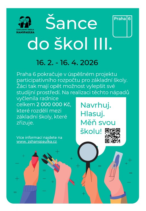 16. února 2026 startuje projekt participativního rozpočtu ŠANCE DO ŠKOL III. Městská část Praha 6 pro naši školu vyčlenila 133 333 Kč.